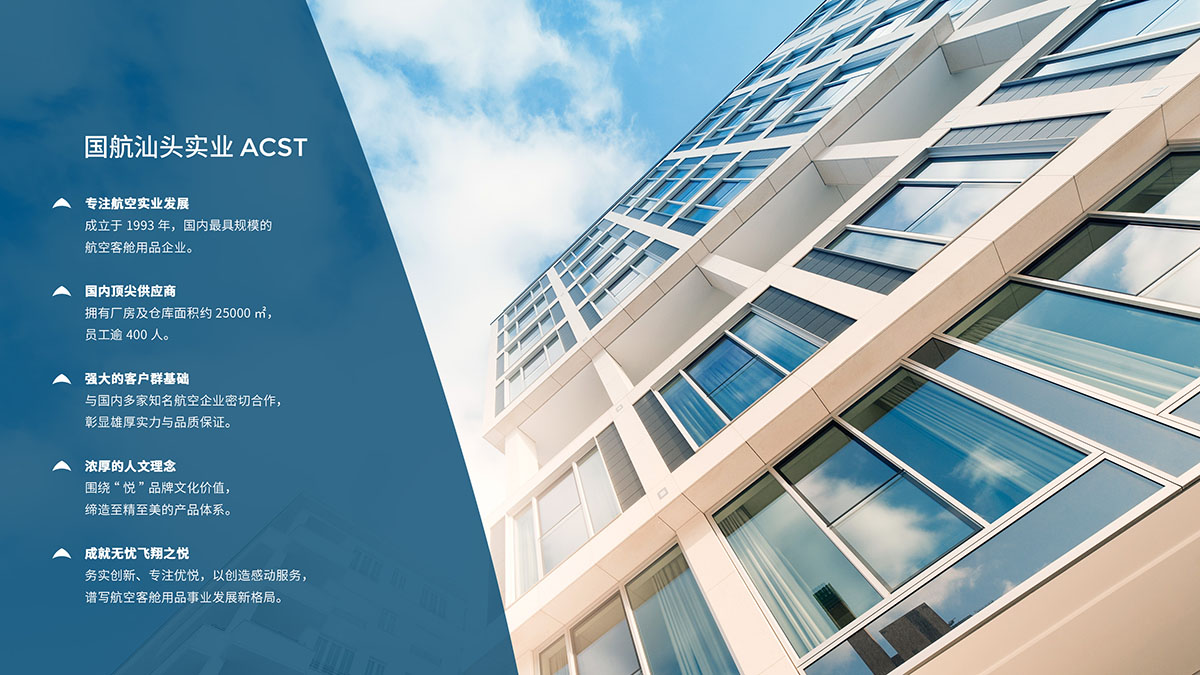 中国国际航空汕头实业发展公司成立于一九九三年,是中国国际航空股份有限公司控股子公司,生产基地坐落于广东省汕头经济特区。我们集研发、设计、生产及销售为一体,深耕航空客舱用品领域二十余载,拥有面积约22000㎡的厂房及仓库,员工约四百五十人,是现时中国最具规模的高质量航空用品生产商及供应商。
